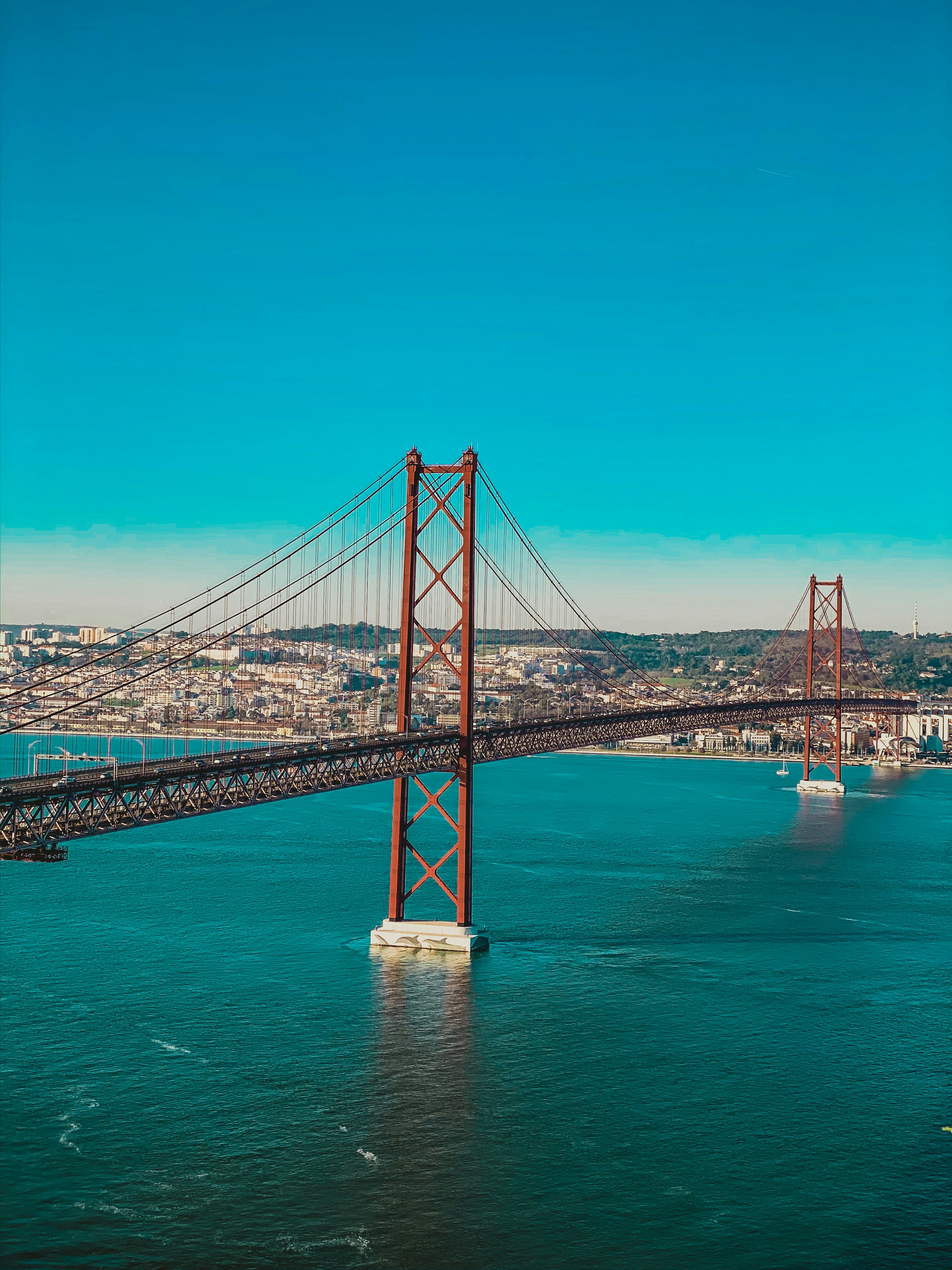 The ponte 25 de abril (german: Ponte 25 de abril (37444852135).jpg. A ponte 25 de abril é uma ponte suspensa rodoferroviária sobre o rio tejo que liga a cidade de lisboa (margem norte) à cidade de almada (margem sul), em portugal.a ponte atravessa o estuário do tejo na parte final e mais estreita — o designado gargalo do tejo. Because of its similar coloring, it is often compared to san. It connects lisbon to the town of almada, on the left bank of the tagus river.